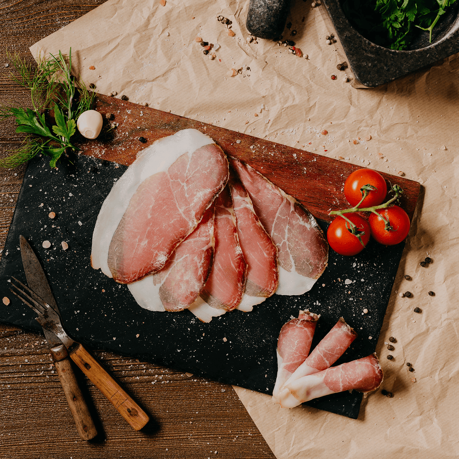 Sertéseinket adalékanyagmentes takarmányokkal etetjük. Nem használunk hozzáadott szabad aminosavakat, genetikailag módosított és ipari alapanyagokat. A termékeket tartósítószerek nélkül, hagyományosan készítjük. A füstölés és érlelés természetes módon történik.